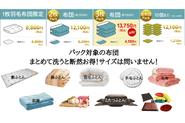 ※座布団パックは〜60cm未満が対象です。 ※「何でもOK」のパックでは、敷ふとん/掛ふとん/羽毛/羊毛/毛布/こたつ布団などを自由に組み合わせられます。